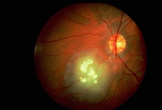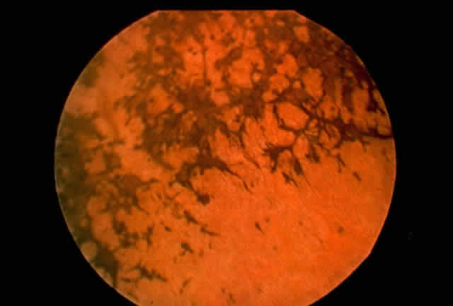 CHOROIDEREMIA The recent discovery of the molecular defect in choroideremia is an excellent example of the power of molecular studies in advancing our understanding of disease pathogenesis. Choroideremia is a hereditary, bilateral, and progressive X-linked retinal degeneration characterized by central blindness in affected males during early adulthood. These patients have hemeralopia, decreased vision, and visual field constriction due to atrophy of the choroid and the retinal pigment epithelium (Fig. 6). One notable characteristic of choroideremia in contrast with other retinal degenerations, such as X-linked retinitis pigmentosa, is that carrier females of choroideremia have a typical fundus appearance consisting of linear retinal pigmentation with punctate area of pigment epithelial atrophy.