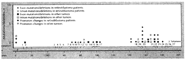 In 1971, Knudson339 reported a landmark study of retinoblastoma in which he suggested that the disease may arise from two mutational events. In the hereditary form of retinoblastoma, a patient inherits one mutant allele and a second mutation occurs somatically. In contrast, the sporadic form of the disease requires two successive somatic mutations in one cell to give rise to tumor. Demonstration of the specific loss of heterozygous chromosome 13q14 markers in retinoblastoma not only implicated this chromosome in the pathogenesis of the disease, but also provided evidence supporting Knudson's “two-hit” theory. The RB1 gene was cloned and sequenced in 1986 and340–342 It not only provided direct proof of Knudson's two-hit hypothesis at the molecular level, but also helped open a new field in human cancer genetics, namely the study of tumor-suppressor genes. Two examples of cancer-causing genes are oncogenes and tumorsuppressor genes. Oncogenes, when activated, facilitate malignant transformation, whereas tumor-suppressor genes inhibit tumor development. A critical step in the identification of RB1 was the isolation of a DNA fragment from a human chromosome 13 library, which was used to construct a DNA probe that recognized a transcript from normal human retinal cells but was absent in retinoblastomas, a finding consistent with the property expected of the wild-type retinoblastoma gene. RB1 is a large gene, spanning approximately 200 kb of genomic DNA. It contains 27 exons and encodes for a 110-kd nuclear protein.343 Approximately 20% of retinoblastomas contain gross chromosomal deletions, whereas the remaining 80% of tumors contain small DNA mutations, including point mutations. In Figure 17, we schematically summarize the mutations found to date in RB1.11,18,20,28,29,37,49,344–356 Notably, a significant proportion of the mutations occur in the noncoding regions of the gene, which may affect RNA splicing, giving rise to a grossly altered retinoblastoma protein. Epigenic changes, such as hypermethylation of the promoter region of RB1, also have been implicated in the pathogenesis of this disease.