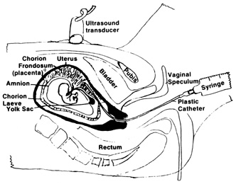 Fluorescent in situ hybridization (FISH) is a new technology utilizing fluorescently labeled DNA probes to detect or confirm gene or chromosome abnormalities.25,26 The sample DNA is first denatured, a process that separates the complementary strands within the DNA double helix structure. The fluorescently labeled probe of interest is then added to the denatured sample mixture and hybridizes with the sample DNA at the target site as it reforms itself back into a double helix. The probe signal can then be seen through a fluorescent microscope and the sample DNA scored for the presence or absence of the signal. FISH can be used in interphase cells to determine the chromosome number or more chromosomes, as well as detect some specific chromosome rearrangements that are characteristic for certain cancers. The primary advantage of interphase FISH is that it can be performed rapidly if necessary, usually within 24 hours, because cell growth is not required. A good example is the Aneuploid Screen Test that is performed on amniotic fluid cells when there is a strong clinical indication for one of the common trisomies. The sample nuclei are denatured and hybridized with DNA probes for chromosomes 13, 18, 21, X, and Y. CHORIONIC VILLUS SAMPLING The indications for CVS are similar for amniocentesis, except for a few rare genetic conditions that require chorionic villi for diagnosis.2 CVS is generally performed at 10 to 12 weeks' gestation. Similar to other first trimester methods, CVS allows for results earlier that can provide reassurance or allow for earlier and safer methods of pregnancy termination. Similar to amniocentesis, CVS is performed under ultrasound guidance. It can be performed either transabdominally or transcervically (Fig 4). Table 5 lists the contraindications and relative contraindications for CVS. TABLE 5. Contraindications and Relative Contraindications for Chorionic Villus Sampling