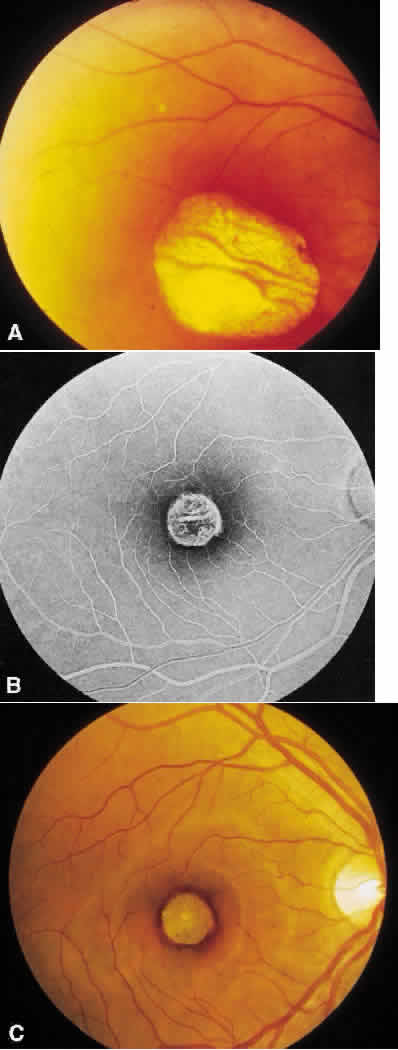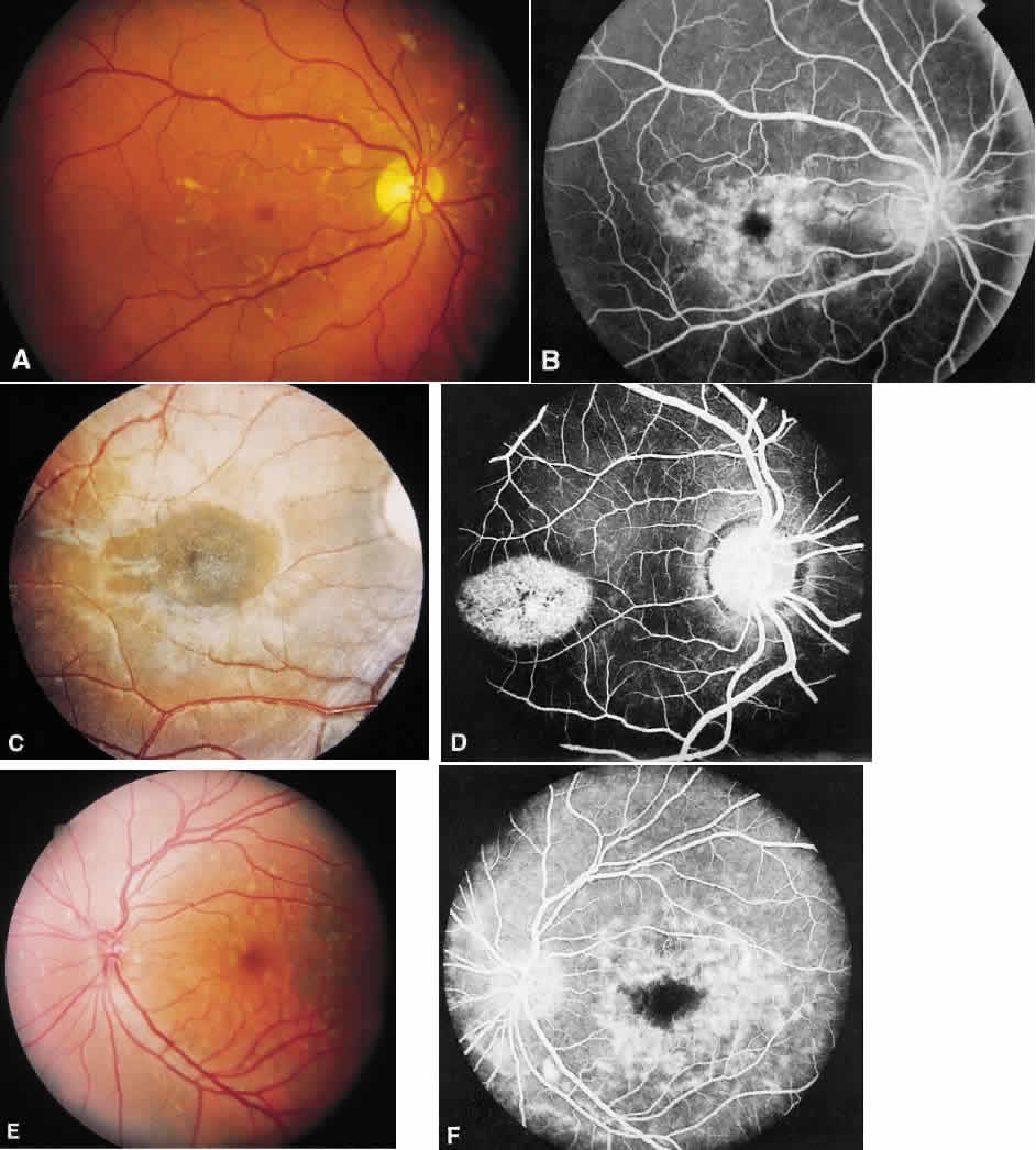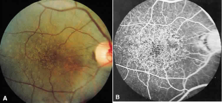 generalized visual dysfunction, and a stable or extremely slow progression. The typical fundus appearance includes focal and confluent drusenlike lesions in the macula and periphery, nonspecific mild pigmentary abnormalities, macular hemorrhage and disciformlike degeneration suggesting choroidal neovascularization, and a marked circumscribed area of chorioretinal atrophy suggesting a coloboma. Although one would assume that the milder changes that occur in the younger persons would deteriorate with time, any lesion may be seen in any age group. In addition, a stable fundus appearance has been documented in a 20-year follow-up of the large kindred seen in North Carolina with progression of the macular lesion seen in only 1 of 24 members.76 |
