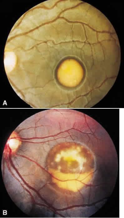 recessive) have been documented. The most common presentation is a history of slowly progressive central vision loss occurring in the first 3 decades of life associated with a bilateral, often symmetric maculopathy. A careful family history should be taken, and appropriate family members should be examined. The retinal abnormalities are confined to the macula or posterior pole. Visual function tests will indicate the retina outside the macula to be normal. |